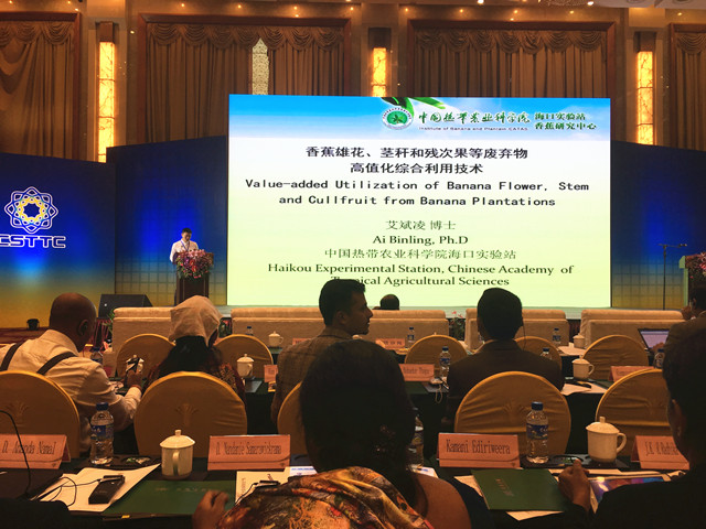 我站参会展示的科研产品有香蕉“热粉一号”,香蕉纤维精干麻与香蕉纤维/苎麻混纺织物,香蕉茎秆有机肥产品和新型果蔬酶促褐变抑制剂。艾斌凌博士在会上作了关于香蕉废弃物综合利用的研究成果报告,报告介绍了我国香蕉产业发展概况,香蕉精干麻及纺织品的研究与开发,香蕉花化学成份的分析及香蕉花降血压胶囊的研究与开发,香蕉残次果的高效利用与开发和香蕉茎杆有机肥的研究与开发等内容。报告结束后诸多专家学者对香蕉废弃物综合利用的研究与开发表现出浓厚兴趣,并与我站一行进行了深入的交流。